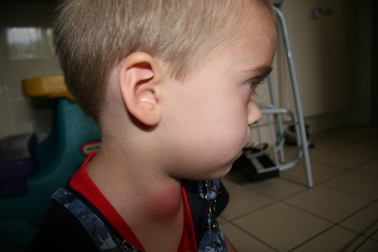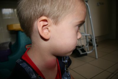 This isn't the best picture, but you can see how swollen and red his neck is. Poor Logan!