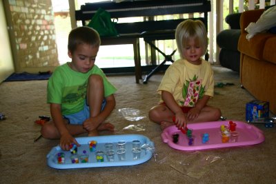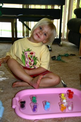 Delenn sorted by color. Logan sorted them into groups of five. Listen to where this activity went from here: Logan decided to make a potion with the pompoms. When Mom objected to getting all the pompoms wet he decided to make some "smells" (lemon, cinnamon, garlic and other things)... -- and then wanted to set up a stand to sell smells for five cents each!). Our neighbors (about five or six people!) came over to Logan's stand and smelled his smells. Logan was really excited to have customers and declared that his store would be open every Saturday and Sunday. Eventually, he changed his mind (and we could dump out his smells), but he sure was proud of himself for earning money.