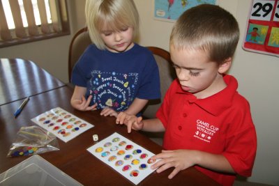 Easter Egg Game: Each player had to roll the dice and cover that number of Easter eggs with a button. The first player to fill his/her card wins