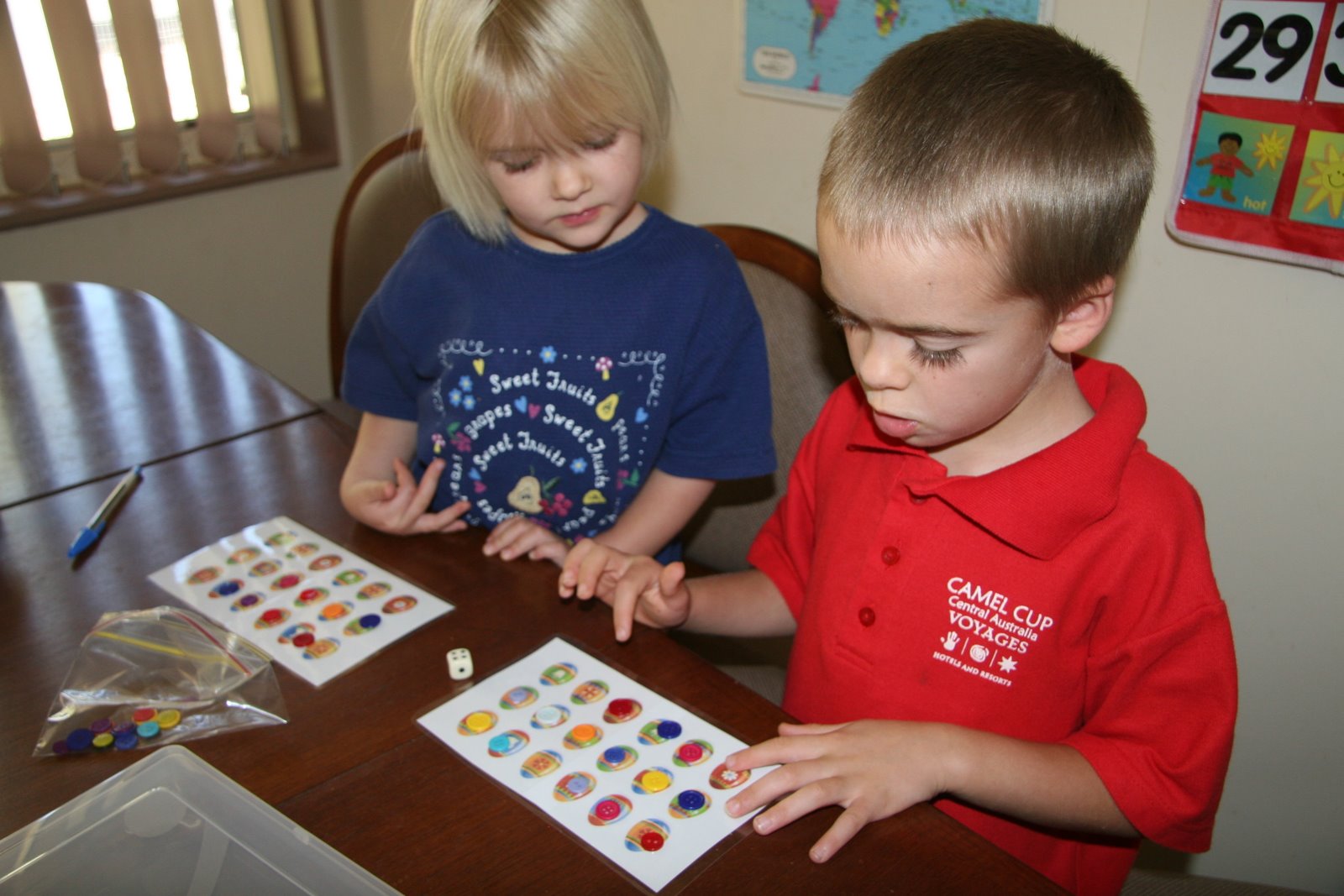 I came across a wonderful Montessori resource for preschoolers (http://mymontessorijourney.typepad.com/). She shares some great activities she does with in her Montessori preschool class. Here are a couple things I set up. Both kids enjoyed them: