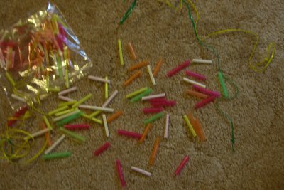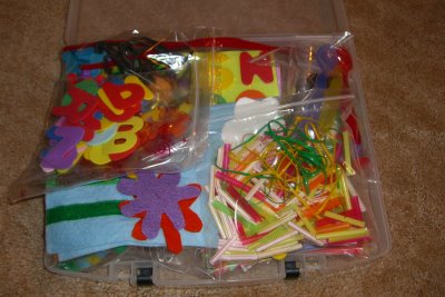 Continuing the trend to be organized, I have a number of preschool activities set to go. Each activity has the items needed, ready to go in its own ziploc bag. Pictured here is a "practical life" activity -- button flowers. I saw this Montessori activity that someone else had made and put it together last night (in about 1/2 hour). Also pictured is a matching activity (match the foam pieces with their mates). I have animals, cars, ocean creatures as one activity and letters as another. Finally there's an activity to string straw pieces to make a necklace.